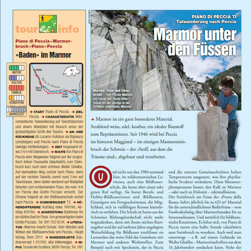 "Seit 1946 wird bei Peccia im hinteren Maggiatal – im einzigen Marmorsteinbruch der Schweiz – der «Stoff, aus dem die Träume sind», abgebaut und verarbeitet. Und nicht nur das: 1984 entstand hier, im wildromantischen Lavizzara, auch eine Bildhauerschule, die heute über einen sehr guten Ruf verfügt.", heisst es weiter. Der Text beschreibt die Gegend und stellt attraktive Wandermöglichkeiten der Region vor.