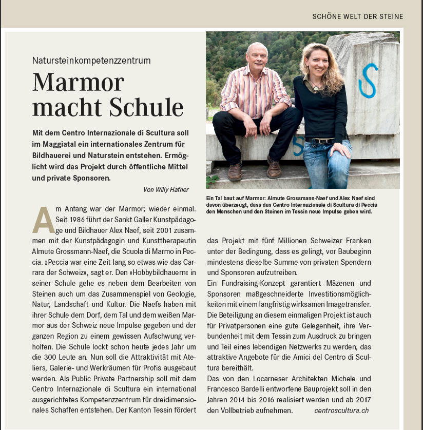 Im Magazin "STEIN" ist ein ganzseitiger Artikel über Peccia, seine Bildhauerschule und das Projekt des Centro Internazionale di Scultura erschienen.
